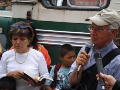 Gloria Cuartas und Padre Javier bei der Andacht auf dem Busbahnhof, der Ort an dem zwei Gemeindemitglieder vor kurzen ermordert wurden